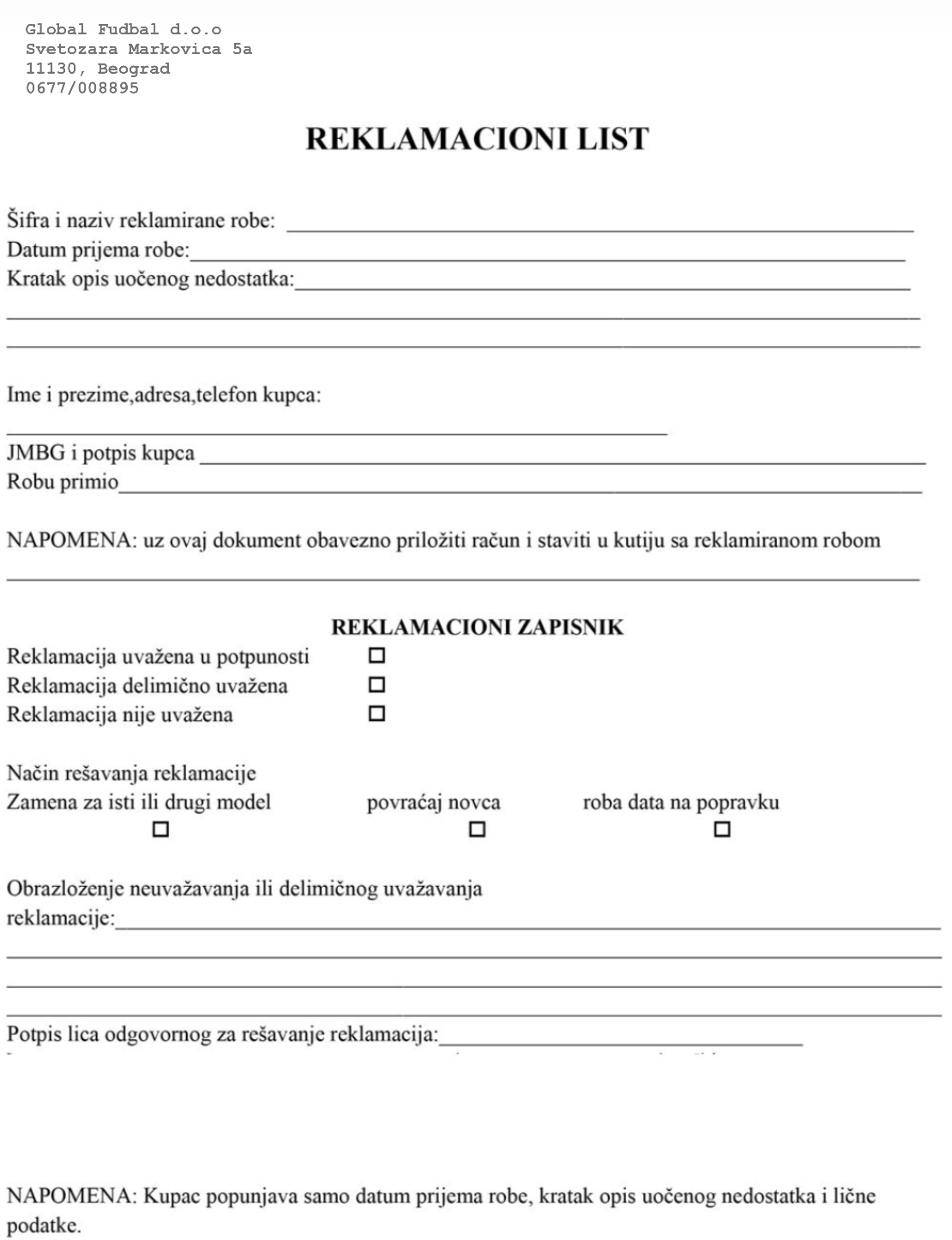 Poručeni artikal, bez popunjavanjem formulara, ne možete samoinicijativno menjati/zahtevati novac.